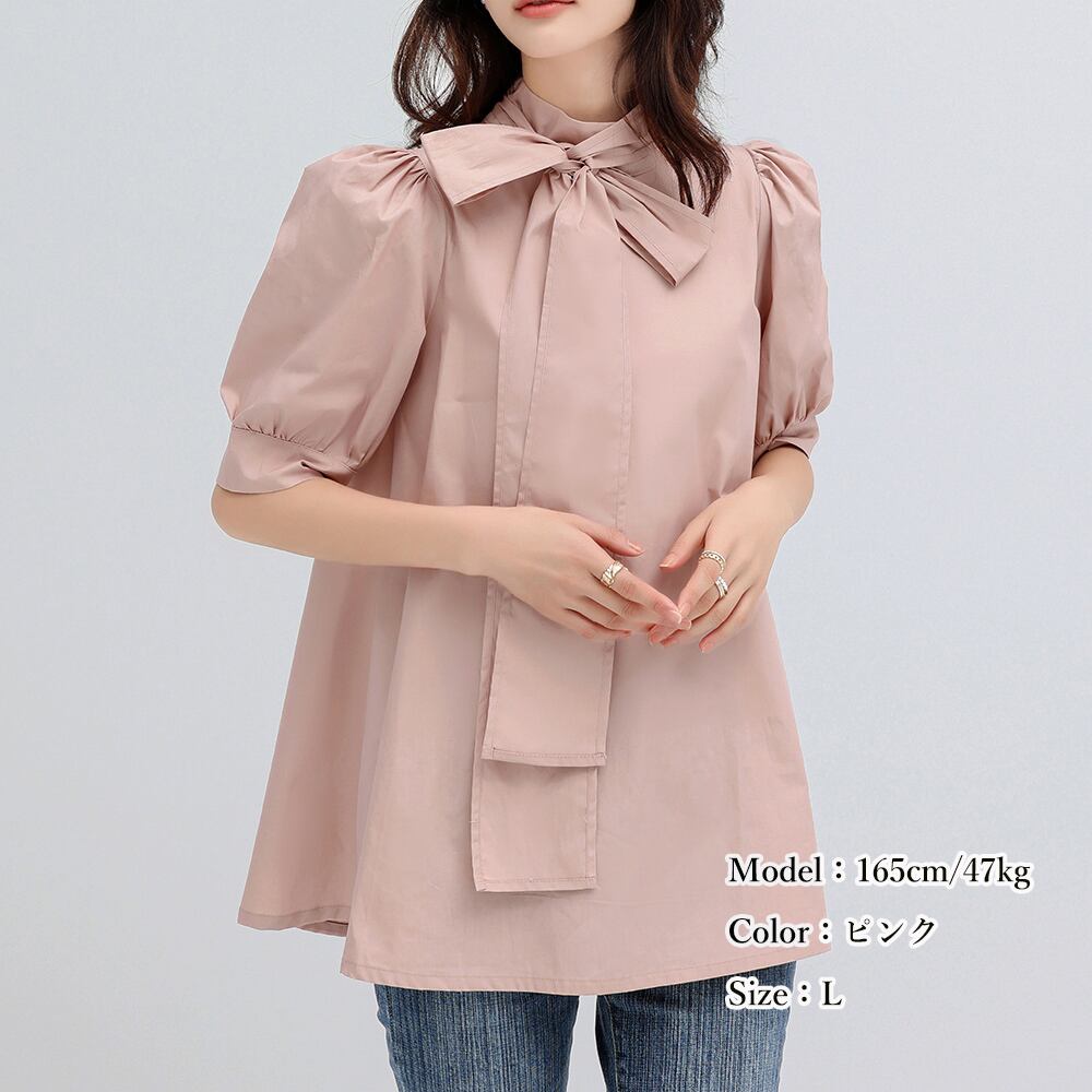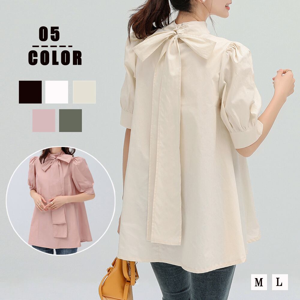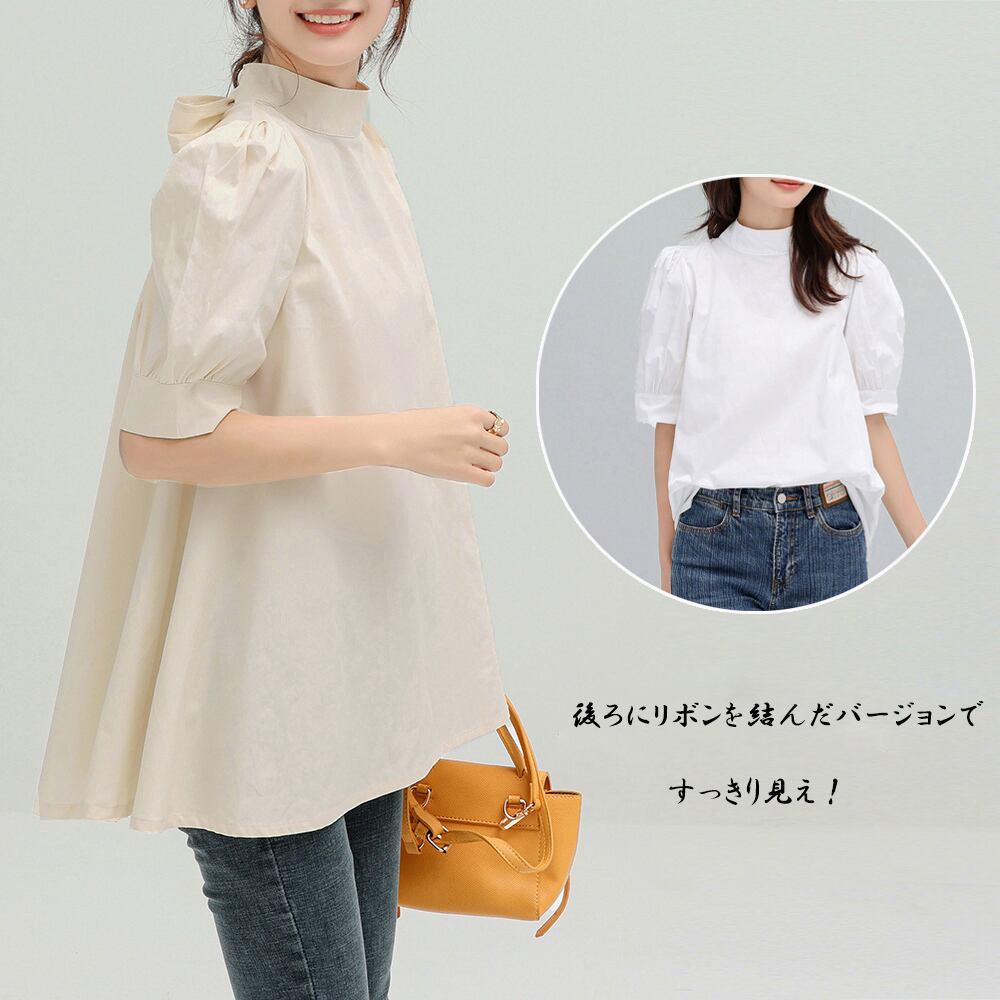 前後2way ボウタイ リボンブラウス 韓国新作 プチハイネック aライン トップス ゆったり パフスリーブ ブラウス