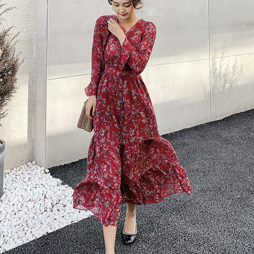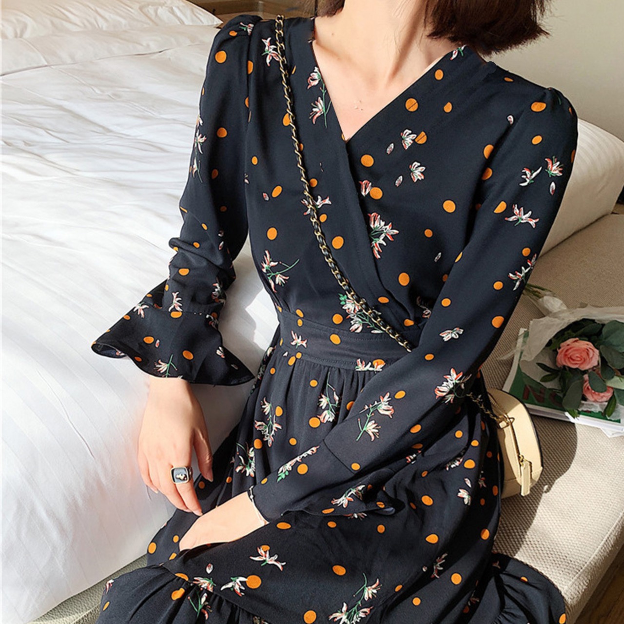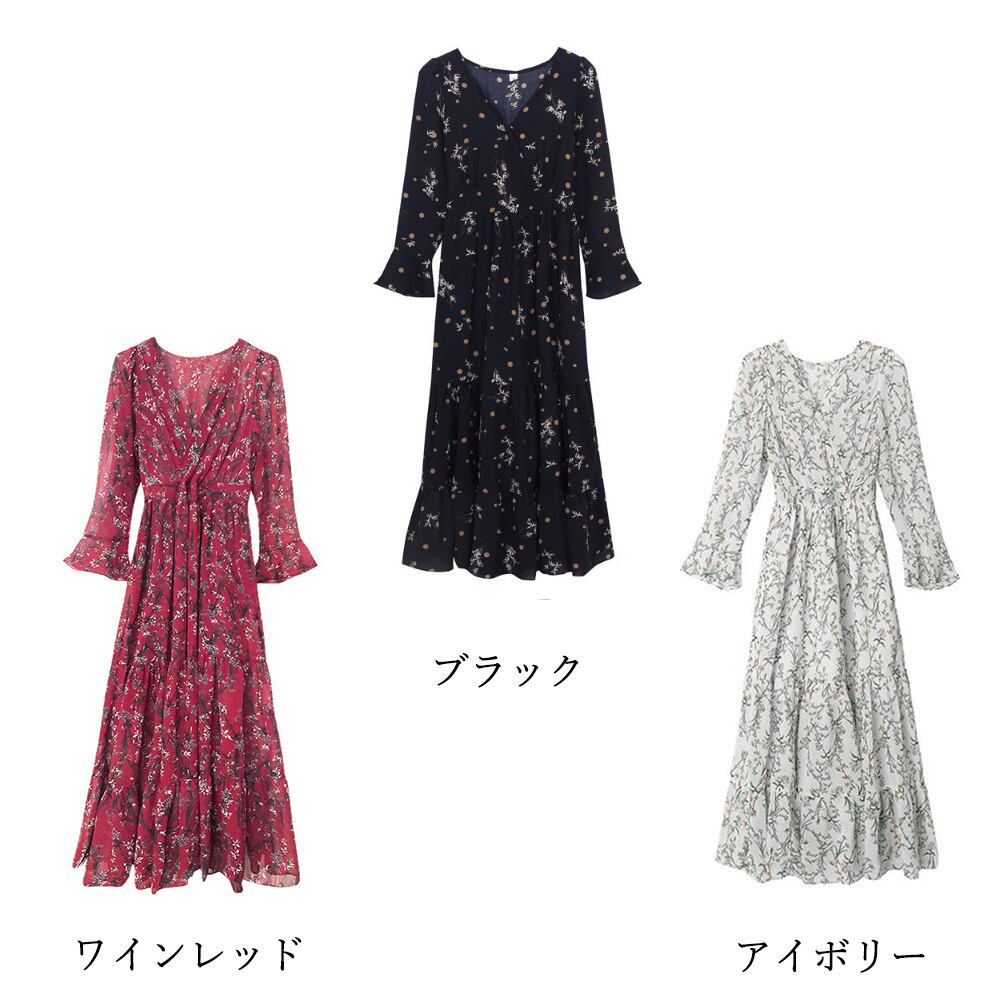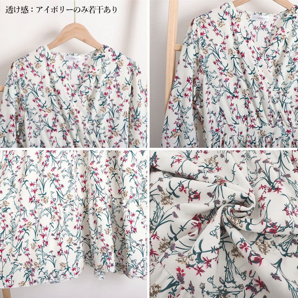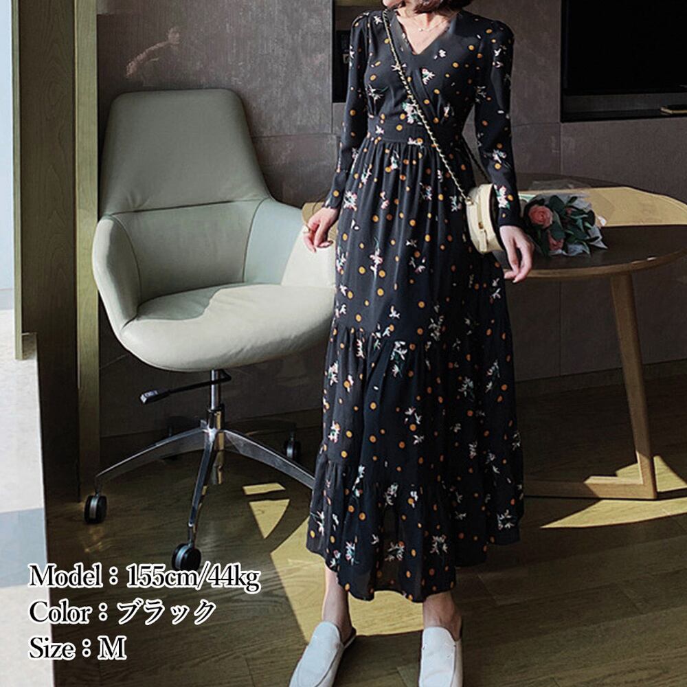レディース 春秋夏 花柄カシュクールワンピ 韓国風Vネック オルチャン フレアワンピース Aライン ハイウエストきれいめ