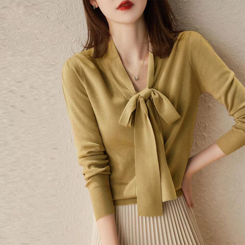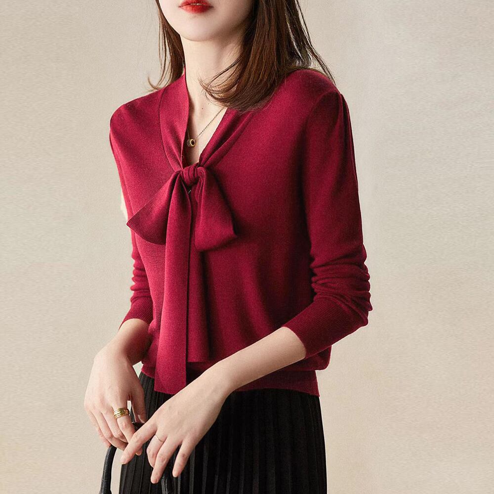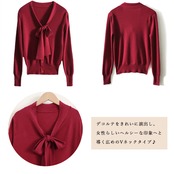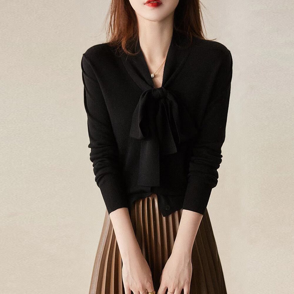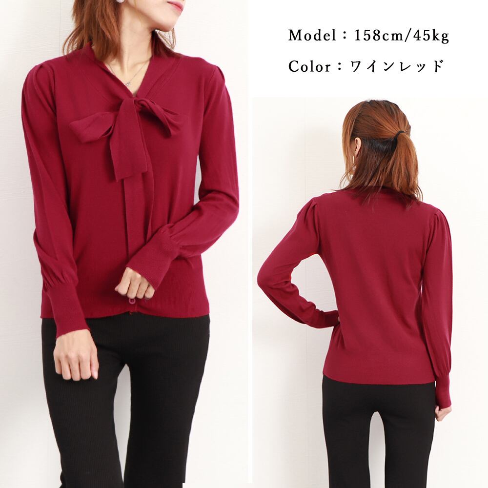 ボウタイ付きでフェミニンな印象を与えるニットトップス