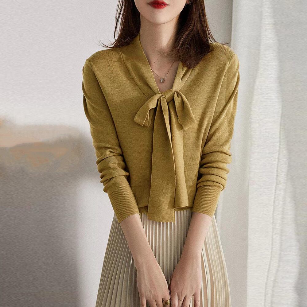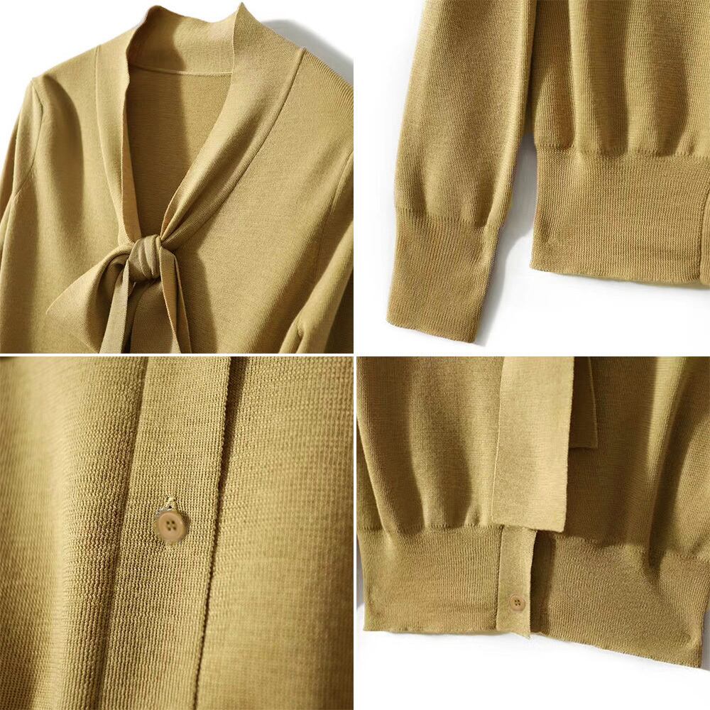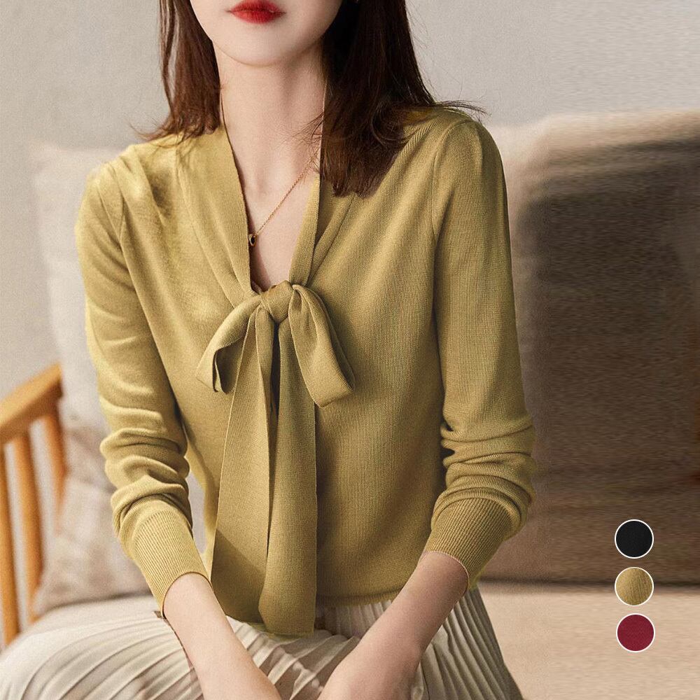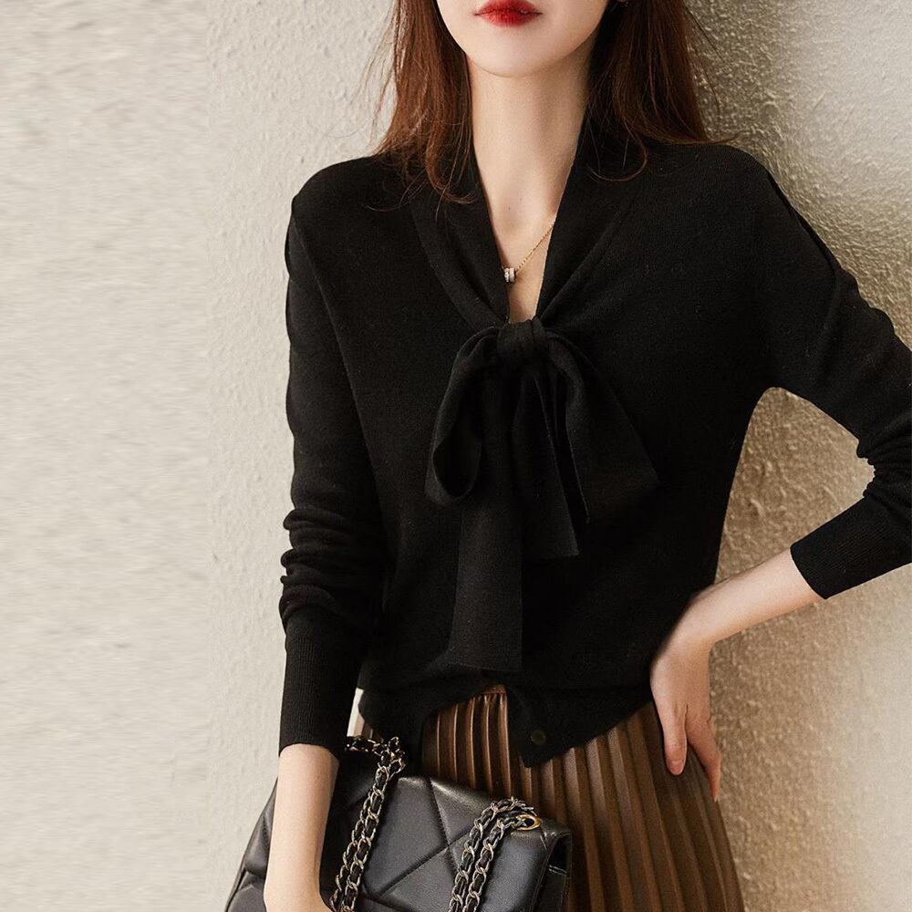 ボウタイ付きでフェミニンな印象を与えるニットトップス