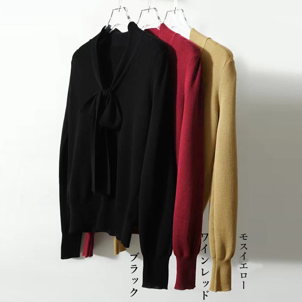 リボン リブニットセーター プルオーバー 長袖 ニットウェア オフィスカジュアル ニットソー 着回し トップス きれいめ