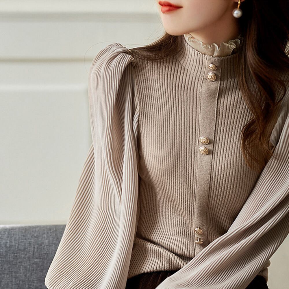 レディース 袖切り替え シフォンプリーツ ブラウス パフスリーブ ドッキングニット プチハイネック トップス 春秋冬