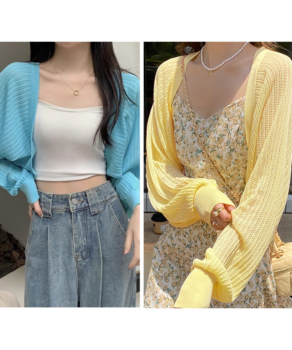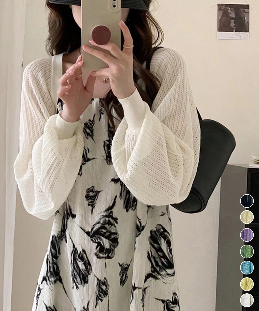 レディース クロップド丈 透かし編みニットカーディガン 冷房対策 ゆったり体型カバー 春夏長袖羽織 韓国風メッシュニット