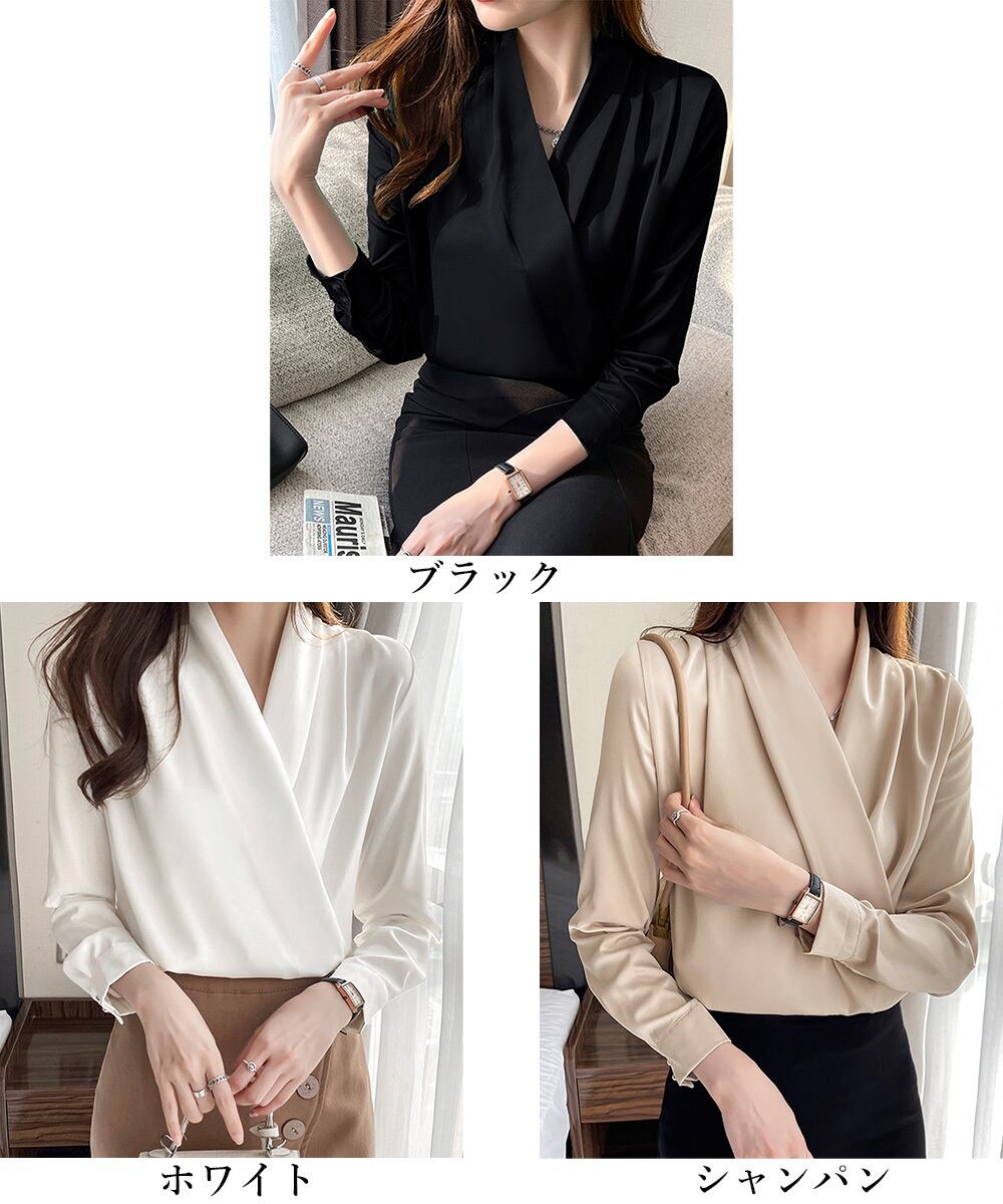 大人女性 サテン風とろみシャツ 通勤服Vネック オフィスカジュアル ドレープシャツ フェミニン 長袖シャツブラウス春夏秋