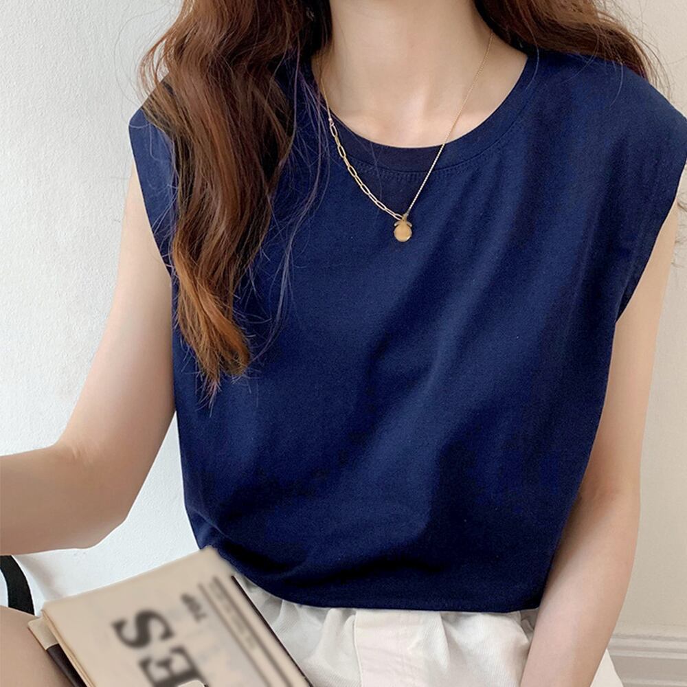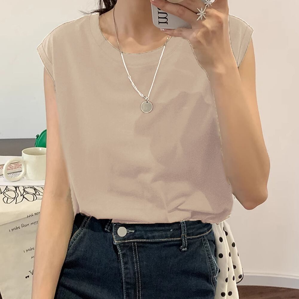 おしゃれ ノースリーブカットソー 無地 クルーネックプルオーバー 韓国ファッショ夏トップス シンプル カジュアルtシャツ