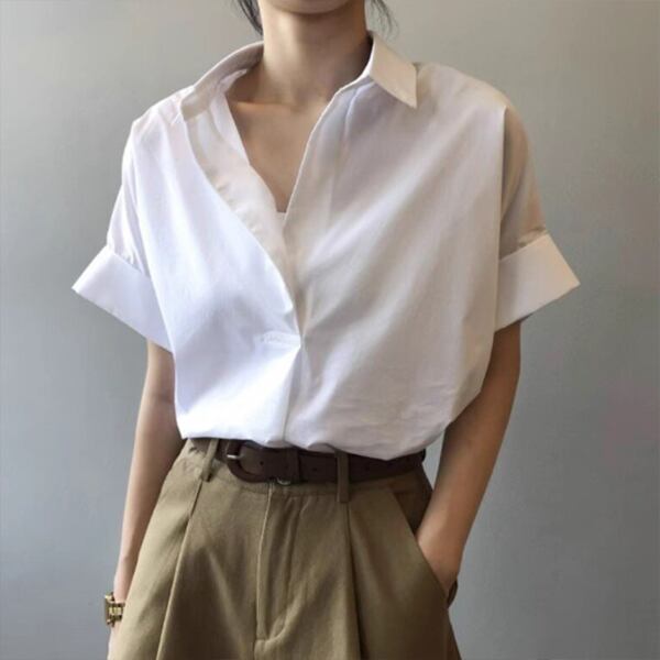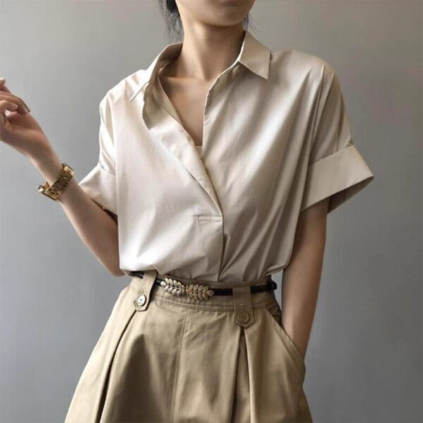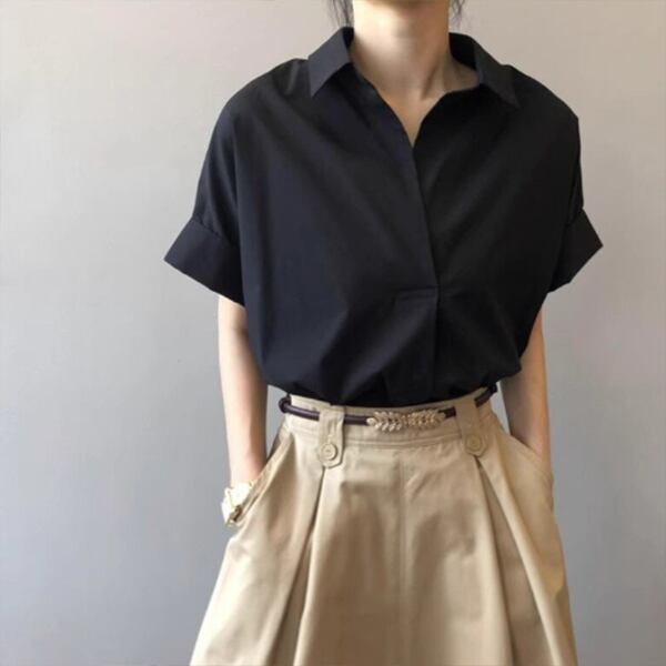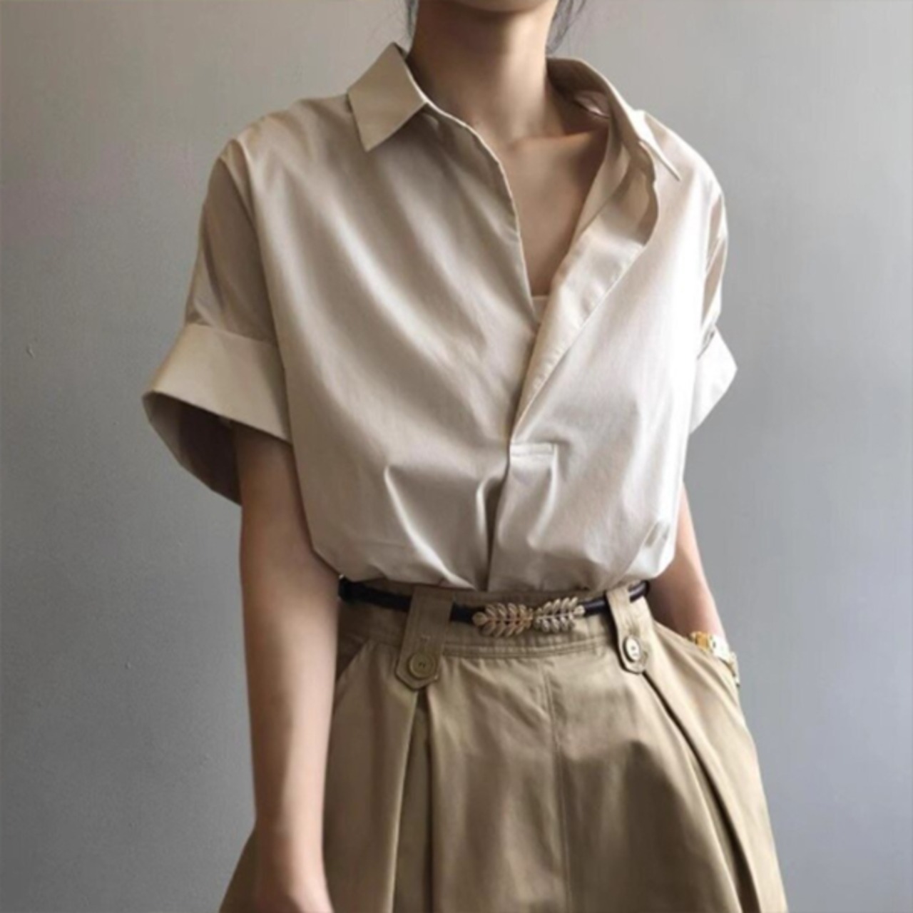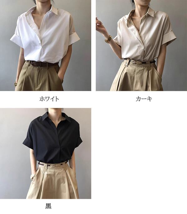 ・フロントのスキッパーデザインが首元をすっきりと魅せ、爽やかな抜け感を演出します。